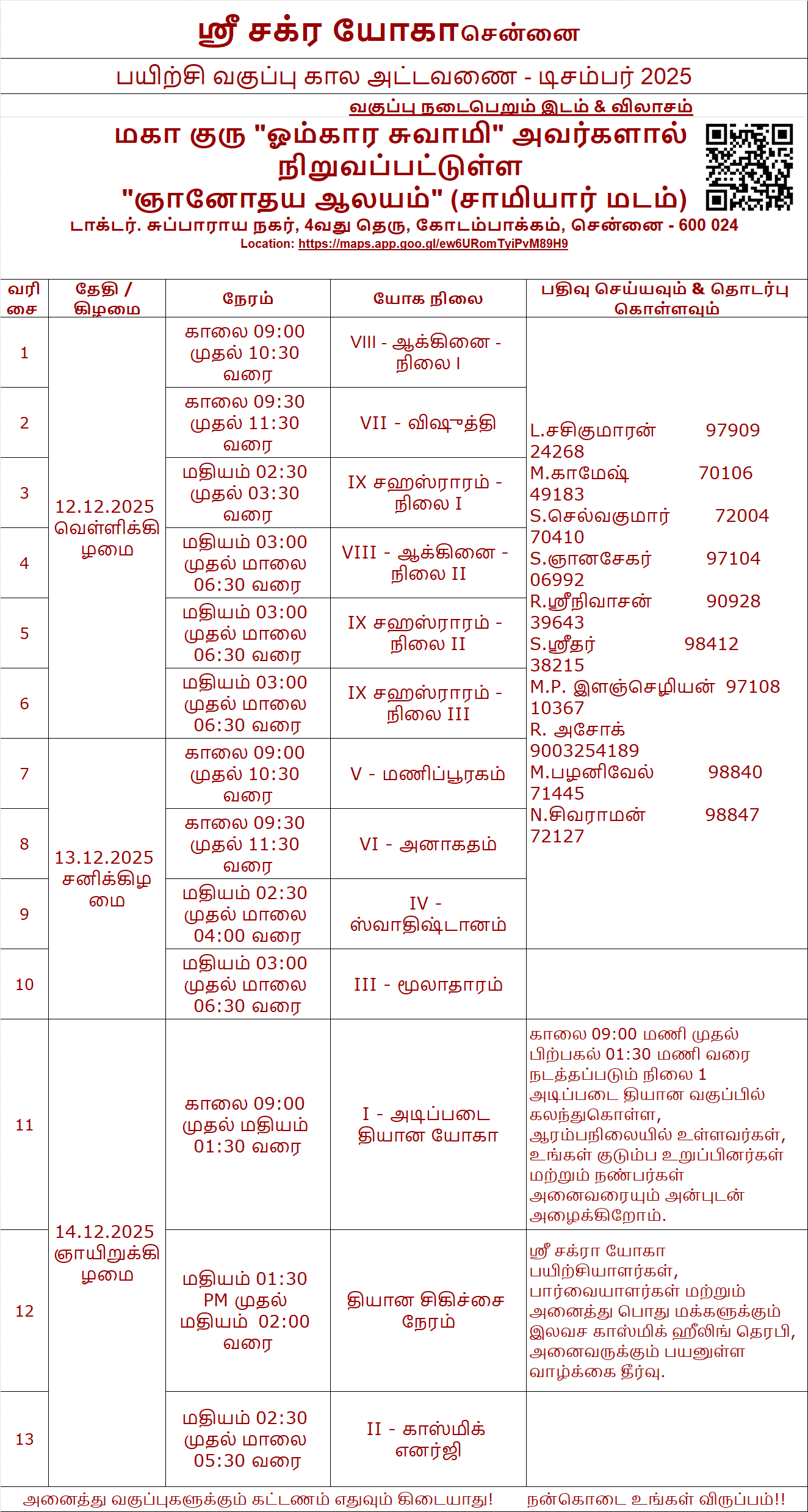 This practice includes the Chakra practice. The 7 chakras plays a vital role in activating the 7 endocrine glands. When these glands are tuned equally we can safeguard the health, reduce the impact of existing disease, increase our immunity, get good education, get memory power, mental power and get a deep sleep and get 16 Aishwarya’s with the help of Universe .We request all from the age of 11 to get benefit out of this excellent opportunity.